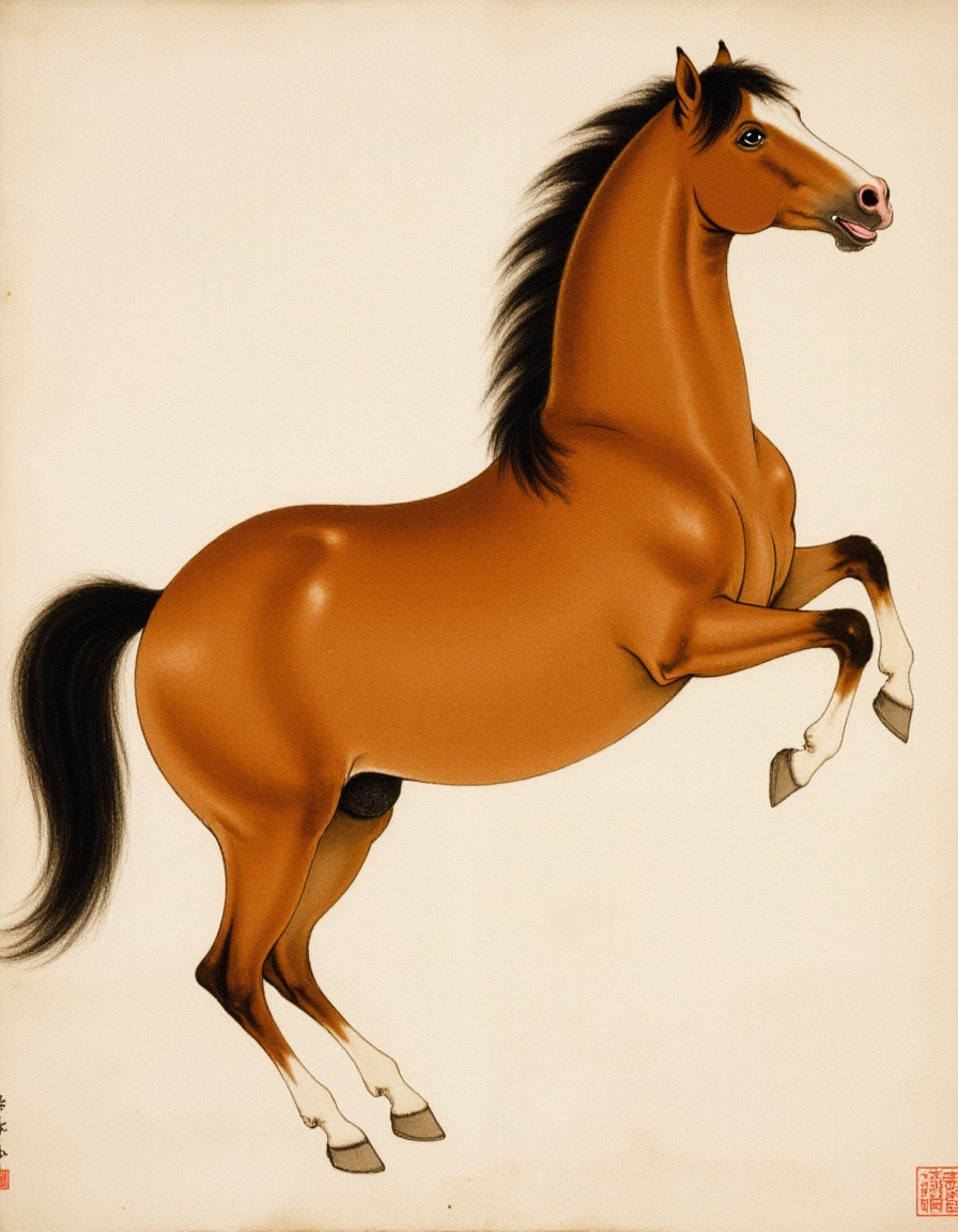 F1hanganHuaM, The image depicts a traditional East Asian painting of a horse. The horse is depicted in a dynamic pose, with its front legs raised as if it is in motion, possibly running or jumping. The horse has a rich brown coat with a darker mane and tail, and its white markings are visible on its legs and face. The background is relatively plain, consisting of a light-colored surface that provides contrast to the horse, allowing it to stand out prominently. The painting style is characterized by its fine lines and subtle shading, typical of traditional East Asian ink wash paintings.