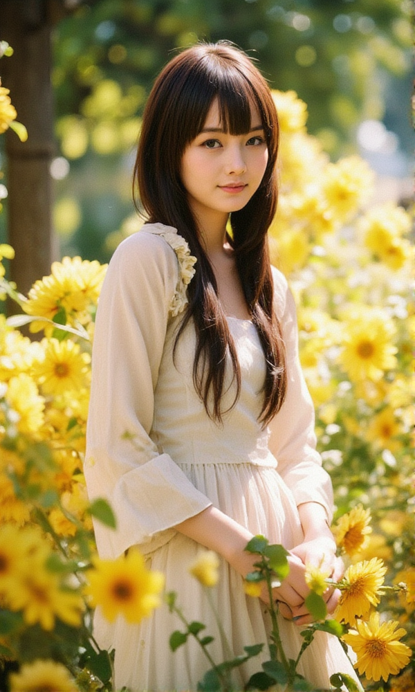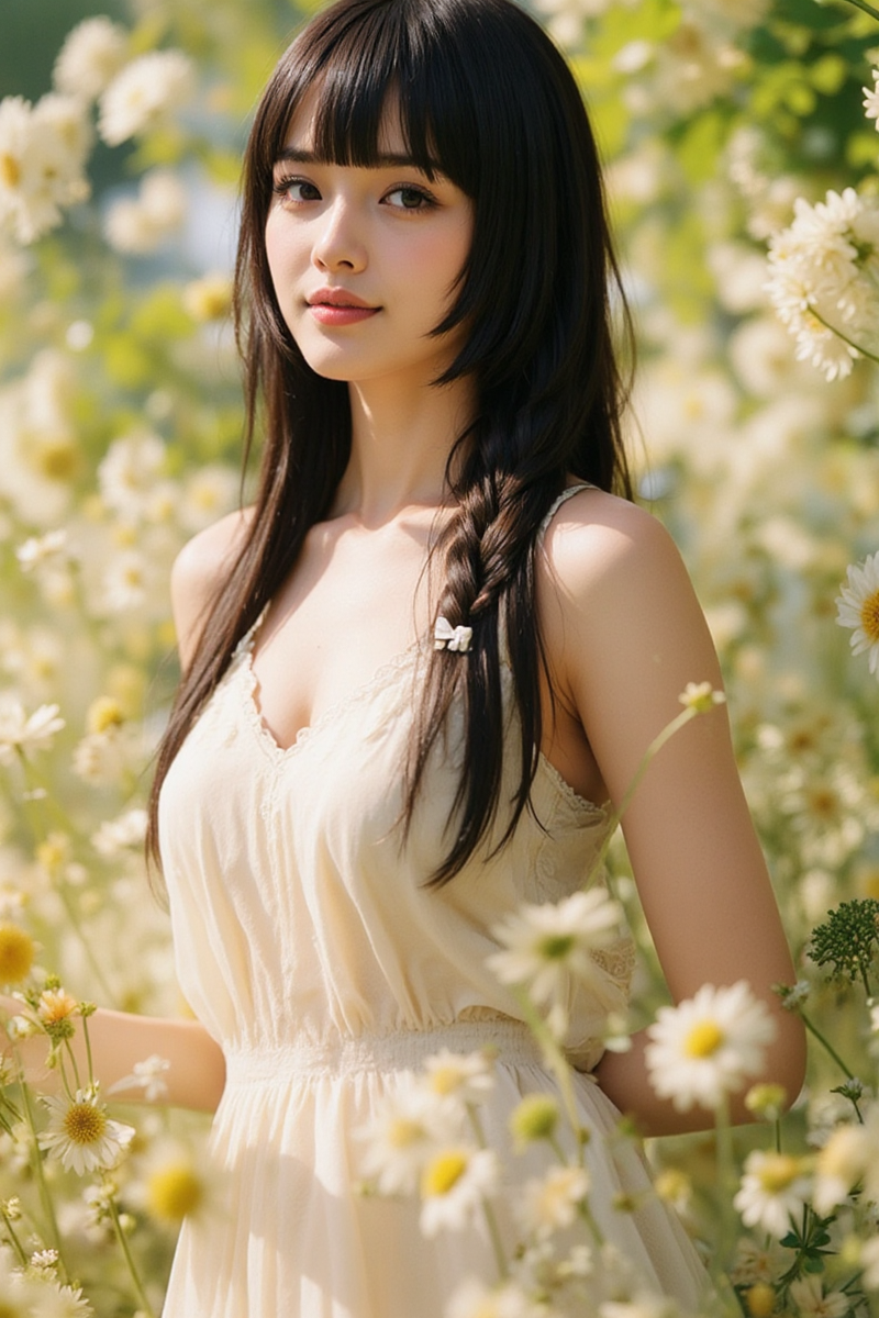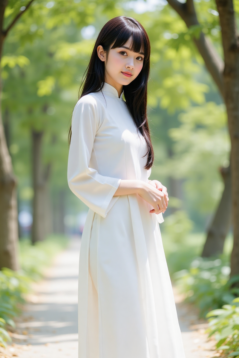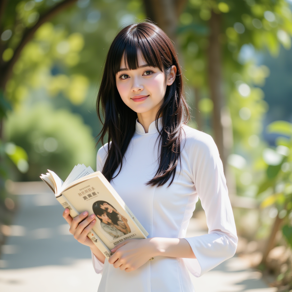 luongthuykhe, a young Asian woman, 18 years old, is centered in the image. She has the himecut hairstyle, long, straight, black hair with bangs and a pleasant expression. She is wearing a traditional white, close-fitting Vietnamese Ao Dai, a long, flowing dress, and holds a book featuring a portrait. Her body posture is relaxed and upright. The background is out of focus, showcasing a blurred outdoor setting with greenery. The lighting is natural and bright, casting soft shadows. The image's overall style is a candid portrait, with a natural and soft aesthetic. The composition is straightforward, placing the subject slightly off-center. The woman is facing directly at the camera and her gaze is neutral. The colors are primarily muted tones of white, light green, and brown. The overall atmosphere is serene and peaceful.