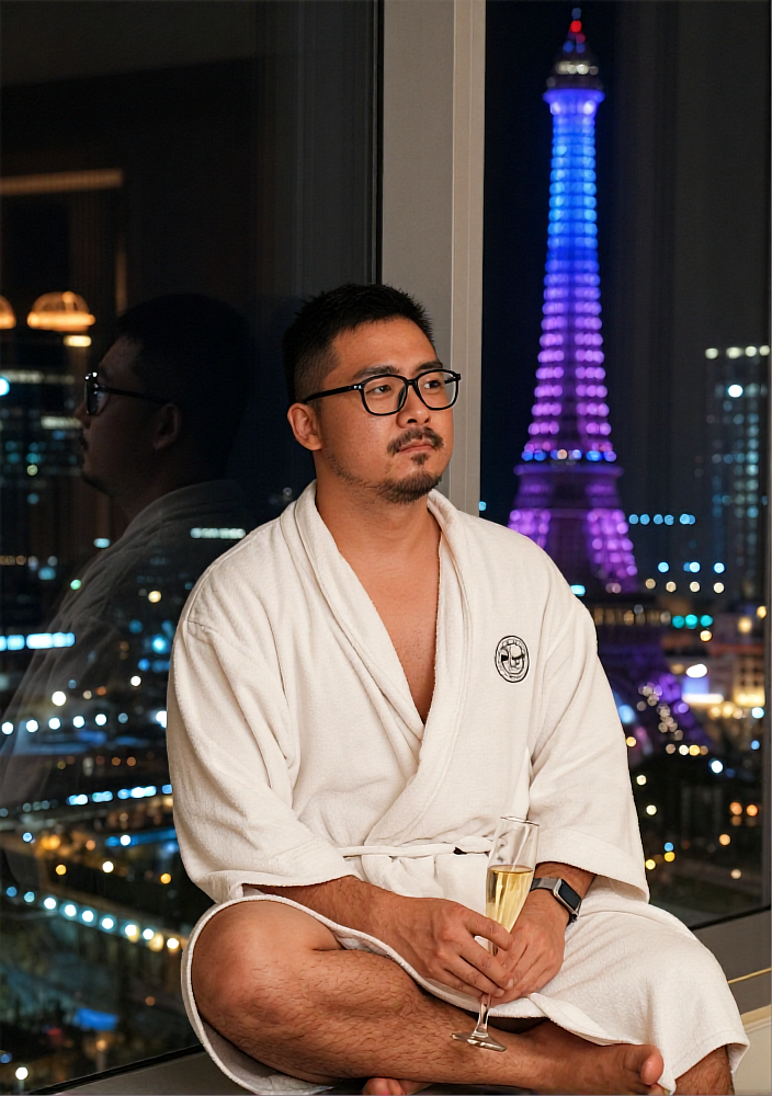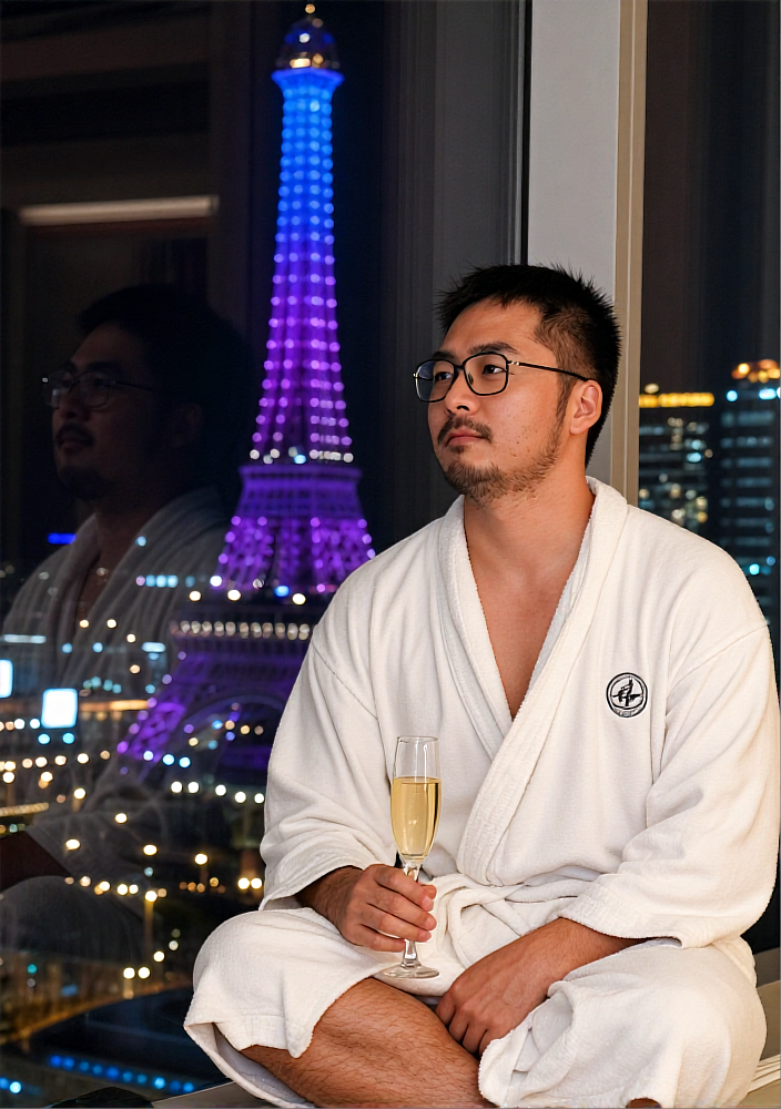ZitJohnpark, A man with short dark hair, glasses, and a light beard sits cross-legged in a white terry cloth robe, holding a flute of golden champagne. He gazes thoughtfully toward the right, his expression calm and contemplative. Behind him, a large window reveals a nighttime cityscape dominated by a brightly lit replica of the Eiffel Tower, glowing in vertical bands of blue and purple, with scattered bokeh lights from surrounding buildings. His reflection appears on the left side of the window, mirroring his profile and the illuminated tower. The robe bears a circular embroidered logo on the chest, and soft indoor lighting highlights his features and the texture of the fabric, creating a relaxed yet elegant atmosphere.