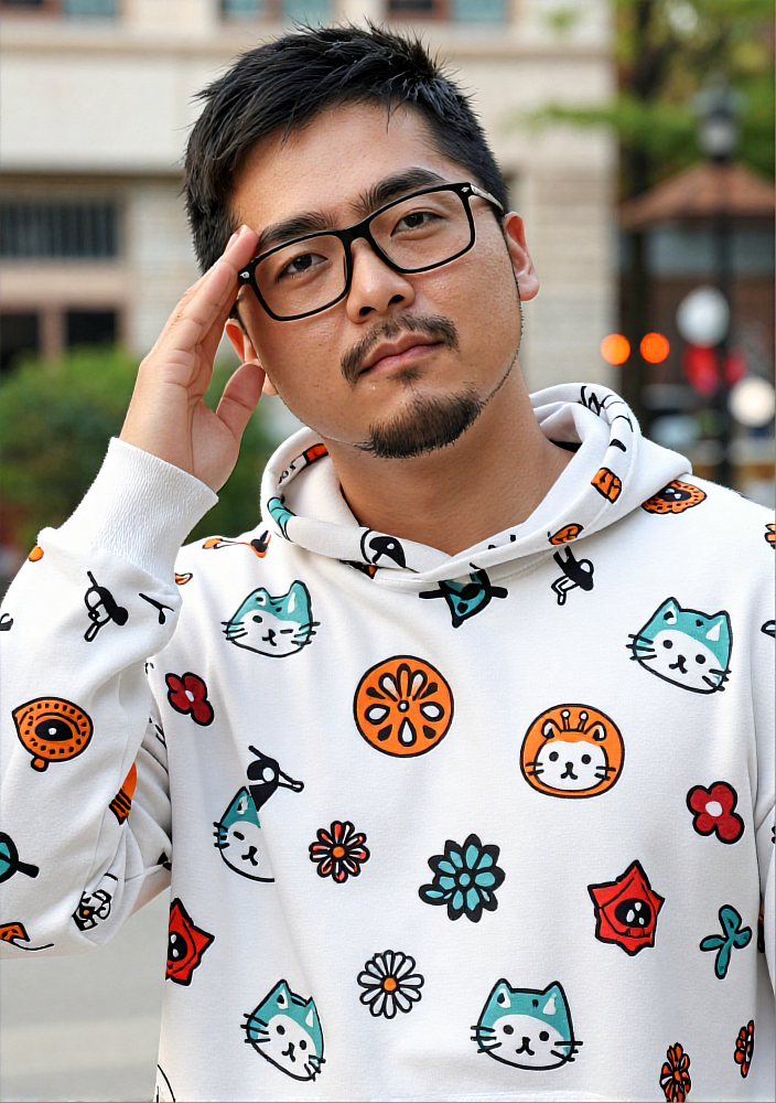 ZitJohnpark, A young man with dark hair, a trimmed goatee, and black-rimmed glasses gazes slightly upward with a calm, contemplative expression. His right hand gently touches his temple near the glasses, while he wears a white hooded sweatshirt adorned with colorful, stylized cartoon motifs—including cat-like faces, floral patterns, and abstract symbols in orange, teal, black, and red. The background is softly blurred, revealing hints of outdoor architecture, greenery, and distant bokeh lights, suggesting a daytime urban or campus setting. Natural light illuminates his face evenly, highlighting the texture of his clothing and the subtle sheen on his skin.