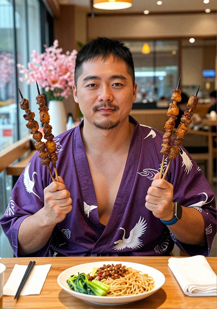 ZitJohnpark, A man with short dark hair and a light beard sits at a wooden table, holding two skewers of golden-brown grilled meat in both hands, presenting them toward the camera. He wears a loose purple robe with white crane and leaf patterns, open at the chest, and a blue wristband on his left wrist. In front of him rests a plate of noodles topped with greens, minced meat, and chili oil, alongside chopsticks and a folded white napkin. A blurred pink floral arrangement in a white vase appears over his left shoulder, while warm ambient lighting illuminates the scene against a softly lit restaurant interior with large windows and indistinct background elements.