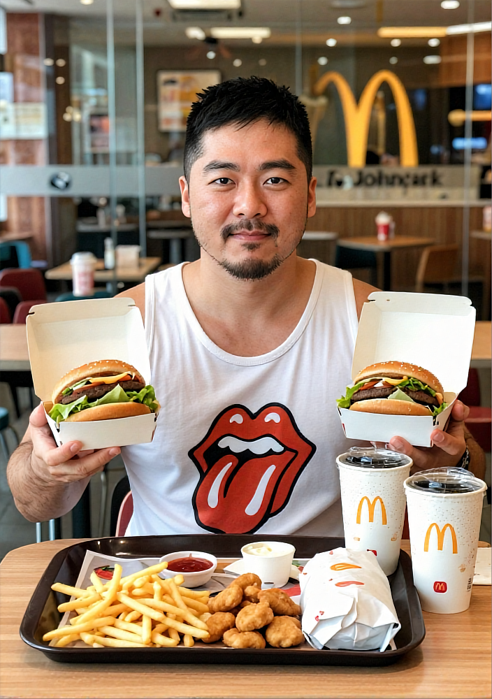 ZitJohnpark, A man with short dark hair and a light beard sits at a wooden table in a brightly lit fast-food restaurant, wearing a white **** top with a colorful cartoon tongue logo. He holds two open burger boxes, each containing a hamburger with visible sesame buns, lettuce, and patties, one in each hand, presenting them toward the camera. In front of him, a black tray holds golden french fries, chicken nuggets with dipping sauce, a wrapped sandwich, and two drinks in white cups with orange speckles and clear lids. Behind him, glass partitions and blurred interior elements—including chairs and illuminated golden arches—suggest a McDonald’s setting. The lighting is even and natural, highlighting the food’s textures and the man’s neutral expression.