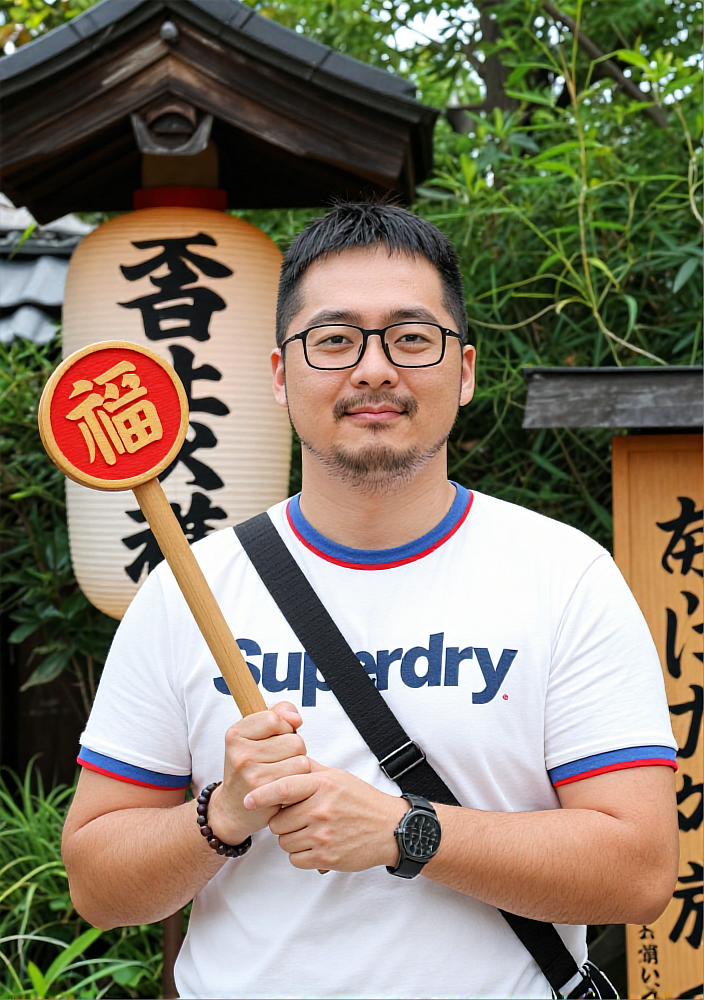 ZitJohnpark, A man with short dark hair, glasses, and a light beard smiles gently while holding a wooden mallet with a circular red-and-gold sign bearing Japanese characters. He wears a white Superdry t-shirt with blue and red trim, a black shoulder strap across his chest, a black watch on his left wrist, and a beaded bracelet on his right. Behind him, a traditional Japanese paper lantern displays black calligraphy, mounted beneath a dark tiled roof structure. Lush green foliage fills the background, and part of a wooden sign with vertical Japanese text is visible to the right. Natural daylight illuminates the scene evenly, highlighting warm wood tones, crisp whites, and vibrant accents.