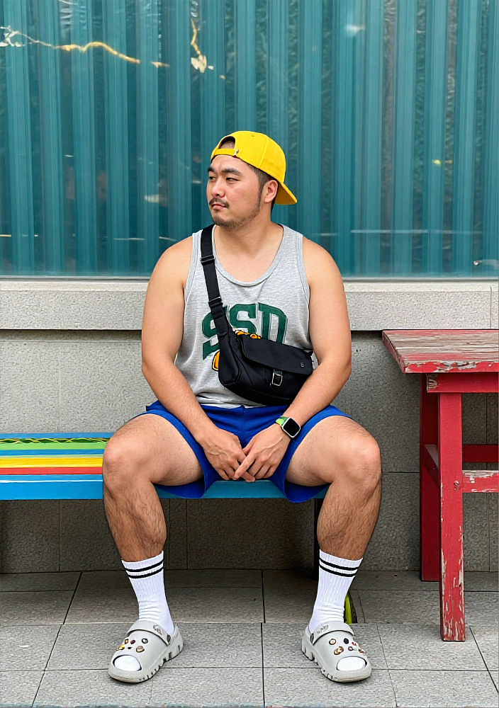ZitJohnpark, A man sits on a colorful woven bench with blue, green, yellow, and red stripes, legs apart, hands clasped over his lap. He wears a yellow baseball cap backward, a gray **** top with green block letters “SD” and a tiger graphic, blue shorts, white crew socks with black stripes, and light gray clog-style sandals adorned with small charms. A black crossbody bag with a flap and buckle rests against his torso, and a smartwatch with a green band is on his left wrist. Behind him, a concrete ledge supports a translucent blue-green corrugated panel reflecting blurred foliage. To his right, a weathered red-painted wooden table stands on the gray tiled ground. Natural daylight illuminates the scene evenly, casting soft shadows.
