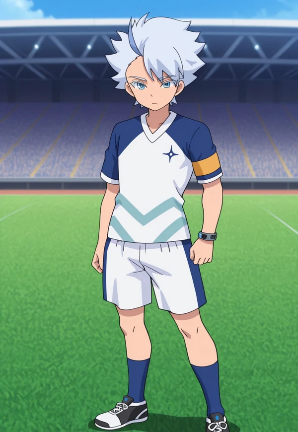 FroyGirikanan, 1boy, male focus, solo, blue eyes, multicolored hair, grey hair, blue hair, supaku soccer uniform, shirt, raglan sleeves, short sleeves, multicolored shirt, blue and white shirt, armband, bracelet, shorts, white shorts, socks, blue socks, shoes, sneakers