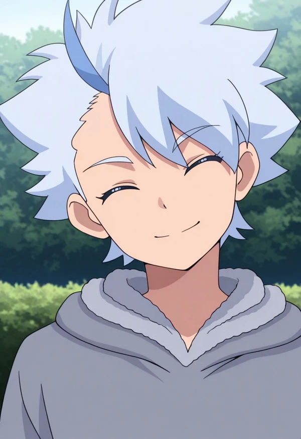 FroyGirikanan, 1boy, male focus, solo, blue eyes, multicolored hair, grey hair, blue hair, hoodie, grey hoodie, hood, pants, black pants, shoes, blue footwear,