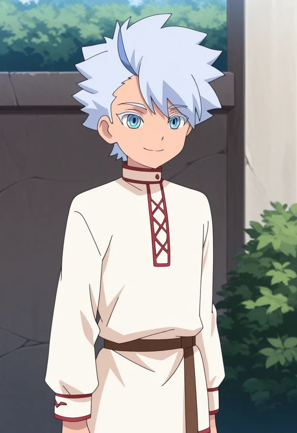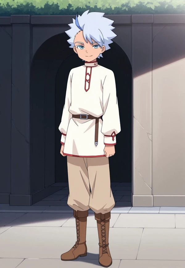 FroyGirikanan, 1boy, male focus, solo, blue eyes, multicolored hair, grey hair, blue hair, tunic, white tunic, long sleeves, pants, brown pants, boots, brown footwear, cross-laced footwear