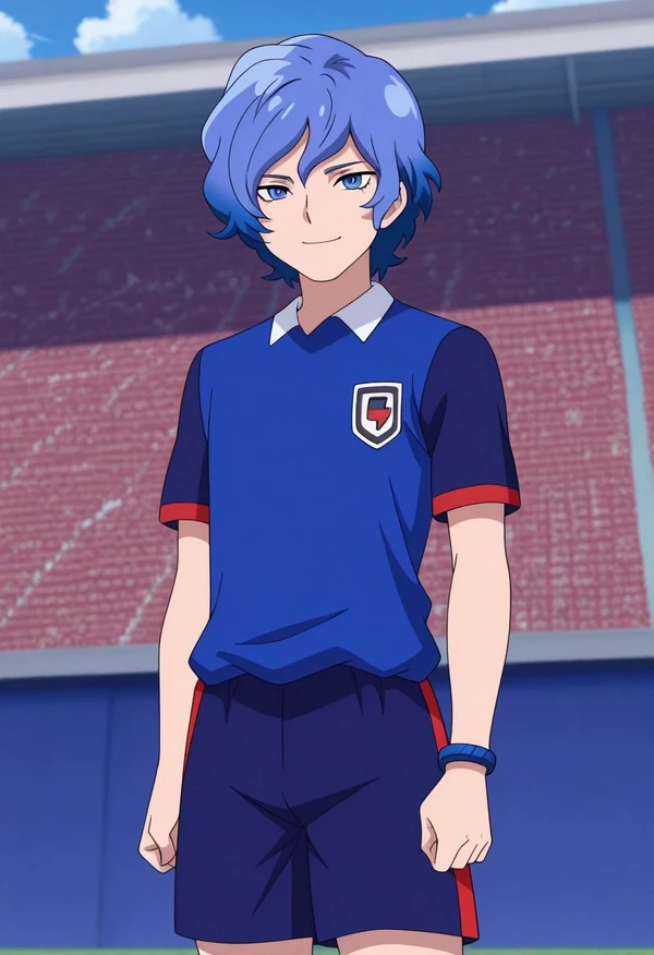 MizukamiyaSeiryuu, 1boy, male focus, solo, blue eyes, blue hair, orion soccer uniform, shirt, blue shirt, raglan sleeves, short sleeves, bracelet, shorts, blue shorts, socks, blue socks, shoes, sneakers,