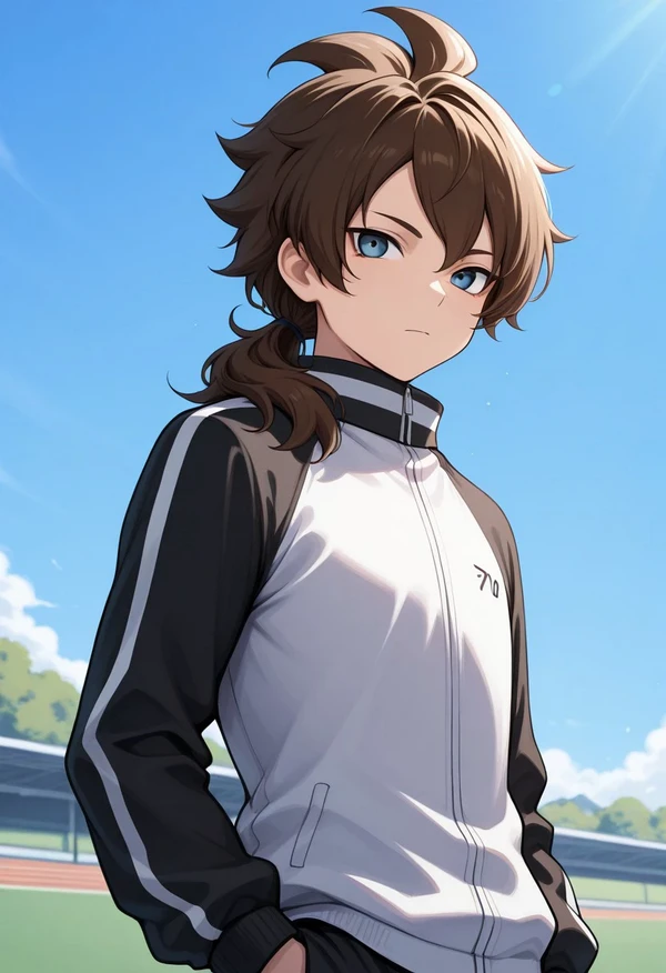 caleb, 1boy, brown hair, long hair, ponytail, low ponytail, blue eyes, track jacket,