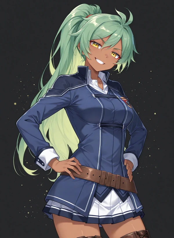 Not my model, this is taken from the V2 pack, the pack and induvial lora upload by the author may differ from one another. source to the model and author https://civitai.com/models/996089 , Leonora, green hair, dark skin, yellow eyes, long hair, ponytail, medium breasts, school uniform, blue jacket, thigh boots,