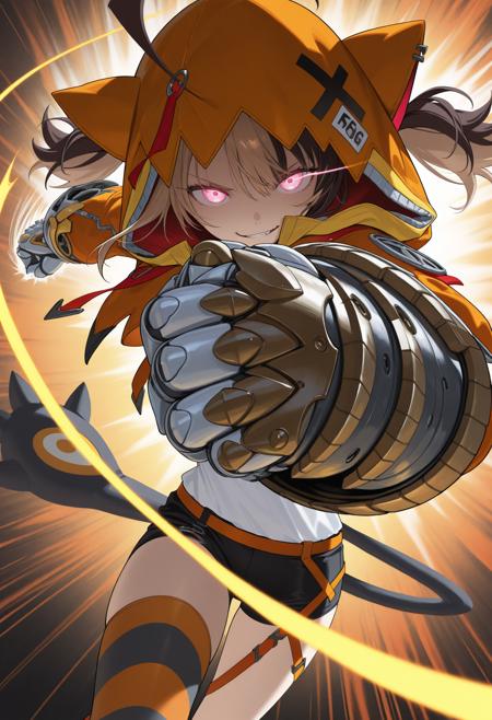 GigiBase, pink eyes, multicolored hair, short twintails, ahoge, animal hood, hood up, orange jacket, cropped jacket, white shirt, mechanical gauntlets, orange belt, black shorts, single thighhigh, striped thighhigh, tail