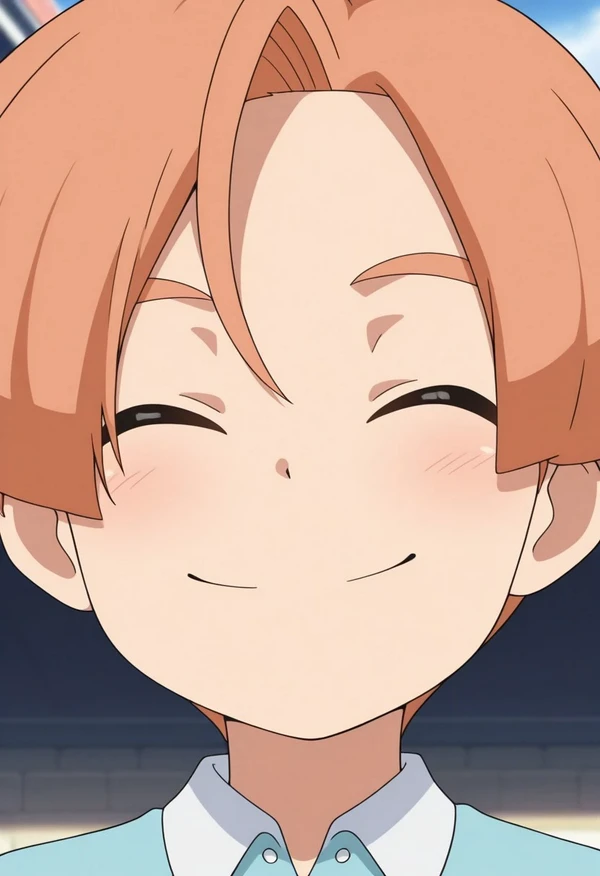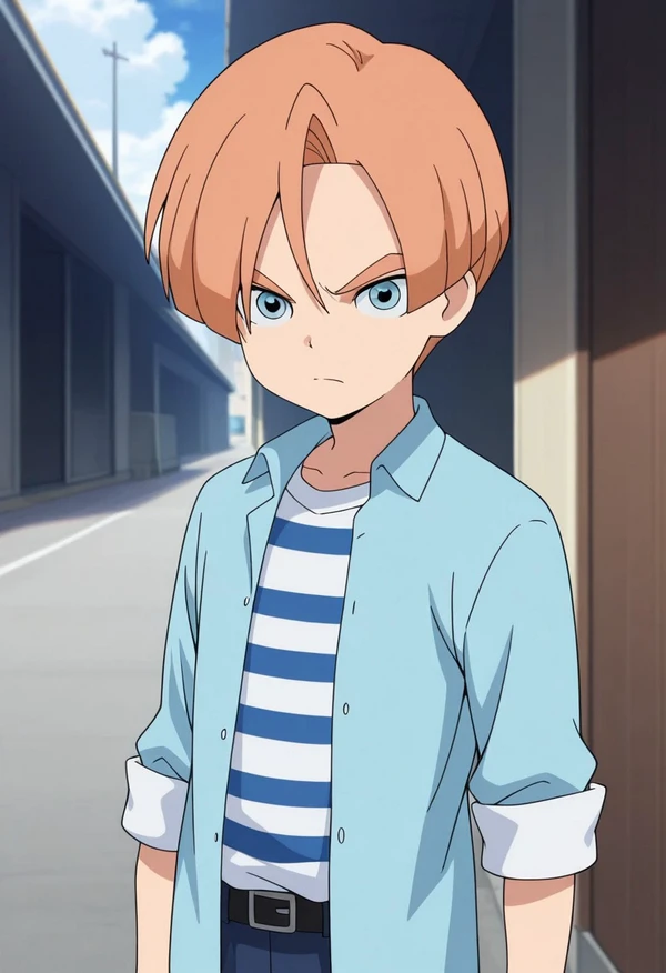 malikkuabel, 1boy, male focus, solo, blue eyes, orange hair, supaku soccer uniform, shirt, raglan sleeves, short sleeves, multicolored shirt, blue and white shirt, bracelet, shorts, white shorts, socks, blue socks, shoes, sneakers,