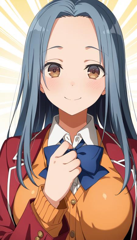 school uniform,red jacket,blazer,orange cardigan,blue bowtie,white shirt,collared shirt,dress shirt,long sleeves,medium breasts,skindentation,miniskirt,white skirt,pleated skirt,black socks,loafers,brown footwear