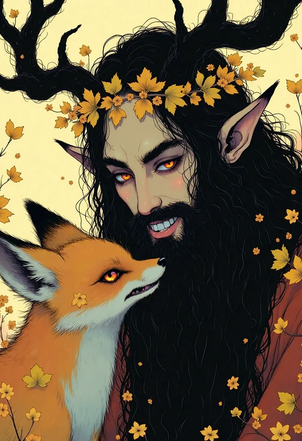 in the style of ppWhimsy, a tranquil woodland scene featuring a woman with flowing white hair and elegant antlers, gently brushing the feathers of a majestic owl perched on her arm, surrounded by glowing mushrooms and soft pink blossoms