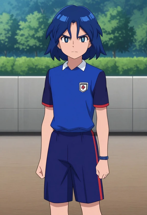 IchihoshiHikaru, 1boy, male focus, solo, blue eyes, blue hair, orion soccer uniform, shirt, blue shirt, raglan sleeves, short sleeves, shorts, blue shorts, socks, blue socks, shoes, sneakers,